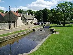 Again there are two channels below the lake, with the main southern channel at a lower level than the northern one, which is called the Flood Dyke. Both cross under the B6034 Worksop to Ollerton road, and leave the Welbeck estate. The land between the two channels is sandy, and the Flood Dyke was used to irrigate the area, forming water meadows. Restoration of the historic structures was undertaken by the County Council in 2010/11, and interpretation boards have been erected to enable visitors to understand the process.[17] Following an archaeological survey, restoration work was carried out on the main sluice in the Flood Dyke, and on a number of stone sluices, wooden hatches and cast iron valves, the latter dating from the 19th century.[18]
