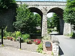 The streams flow into the millpond which supplied Scarcliffe Mill, one of four mills known to have existed along this stretch. Records from Newstead Priory indicate there was a mill here in 1432, and it was marked on maps of the late 19th century. By 1938 the last mill was no longer in use and was demolished in the 1960s. The mill pond has become silted as a result of the poor condition of the dam and sluice, but could form a central part of a conservation area based on Apsley Grange, a large building on the opposite side of the road.[4] Below the mill site, a small brick building once held the pumps used to regulate water levels in the river and pump water to Langwith Colliery. Next the river passes through an arch of a two-arched viaduct built in the 1870s by the Midland Railway. Although passenger traffic ceased in 1964 as part of the Beeching cuts, the line remained open for goods trains, and became part of the Robin Hood Line from Worksop to Nottingham in 1998.[4] The other arch crosses the Whaley Thorns road, under which the river flows immediately afterwards.
