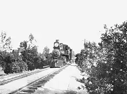 The three trees were planted on the Tibbets' property. One of them died after it was trampled by a cow during the first year it was planted. After the trampling, the two remaining trees were transplanted to property belonging to Sam McCoy to receive better care than L.C. Tibbets, Eliza's husband, could provide.[16] Later, the trees were again transplanted, one at the Mission Inn property in 1903 by President Theodore Roosevelt (this tree died in 1922), and the other at the intersection of Magnolia and Arlington avenues. Eliza Tibbets was honored with a stone marker placed with the last tree. That tree still stands to this day inside a protective fence abutting what is now a major intersection.