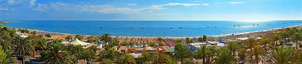 Established in the year 2000, the "Riviera delle Palme" tourist consortium was created to inform, promote and develop the touristic potential of the area internationally. Initially, the consortium only covered the area of San Benedetto del Tronto. Later the nearby seaside resorts of Grottammare and Cupra Marittima were included to the consortium in order to enrich the bathing offer. The consortium promotes important cultural events, highlights the natural beauties of the Adriatic Sea, and showcases riches of the hinterland sambenedettese. The Consortium was expanded to include the municipalities of Offida, Monteprandone, Acquaviva Picena, Ripatransone, and, more recently, also the Lazio municipality of Accumoli (in Province of Rieti).[18] Although not officially part of the tourist consortium, Martinsicuro is often considered part of the Riviera delle Palme.[19]