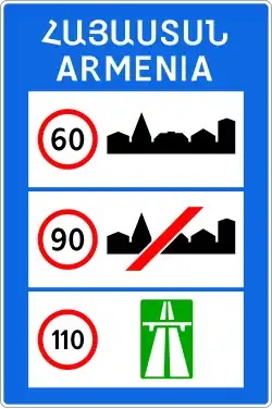 The table below shows road signs with the name of the country at the entrance to their territory and the countries' general speed limits. Such signs are installed only at the entrance to the country. The maximum speed limit when driving on roads in built-up areas, outside built-up areas and on highways in post-Soviet states may vary depending on their traffic regulations, which establish general speed limits. Most post-Soviet states use border road signs with the names of the countries that display their flag and/or coat of arms. Estonia, Latvia and Lithuania use border road signs with the name of the country and 12 stars on a blue background, since these countries are European Union members. However, unlike most European Union countries, Estonia has a border road sign with the coat of arms on the left, the 12 stars of the European Union on the right, and the country names EESTI VABARIIK and REPUBLIC OF ESTONIA in Estonian and English, respectively, in the center.