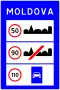 In Moldova, there is a slightly different version of the road sign indicating the entrance of built-up areas: on top, it has the building silhouette on the right and a sign indicating the maximum speed limit on the left, or only the building silhouette in the center, on a yellow background, and on the bottom, it has the name of the built-up area on a white background, similar to Romania.