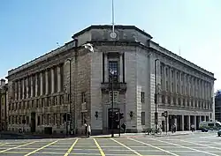 After the war, he got involved in municipal housing and was influenced by the Garden city movement and designed the Pendower council housing estate based on the layout of an English village with the density of twelve to eighteen houses per acre rather than the usual twenty. In 1924 he was a founding member of the Newcastle Upon Tyne Society to Improve the Beauty, Health and Amenities of the City which aimed to regenerate the city centre and give Newcastle a green belt. Later he became chair of the Newcastle Town Planning Committee. He designed the granite towers on the Tyne Bridge, originally planning for a grand arched entrance to the city which was never built.[6] He later went on to design the Grade II listed buildings of Newcastle University Students' Union, in 1924, and Central Police Station, Magistrates Court and Fire Station, in 1934, which won national acclaim.[3] At the time the Evening Chronicle said: "Could Mr Burns Dick have the opportunity of replanning Newcastle as he planned this building, the city might become a modern Athens or Rome."[6]