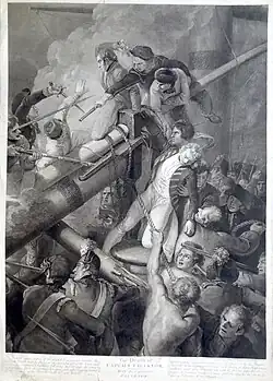 Faulknor was left to attack alone, with his 100 men on the Zebra. Bizarrely his own pilot had the same fear as de Tourelles, and began to turn the sloop away from the enemy. Faulknor approached him and he said he had dreamed he would die, so Faulknor took the wheel himself and sent the man to the rear of the ship, where he was almost instantly hit by a cannonball: the only member of the crew to die.[4] He came closer to the fort than originally planned, and using ladders of bamboo scaled its walls at the head of his men and had a lucky escape when a wooden cartouche (powder cartridge) box strapped to his waist was struck by grapeshot but left him unharmed. His men reached the top of the outer wall and were met with a volley of musket fire which injured only three of the men. They drew their cutlasses ready to attack, but the French turned and fled into the main fortress.[5]