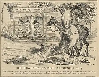 On 30 May 1868 the Sydney Punch published a cartoon captioned 'Old Blowhard's Station Experiences, No. 5' which was based on the reports of White's encounter with bushrangers near the Gympie Creek diggings. The cartoon, one of a series of 'Old Blowhard' parodies in the Sydney Punch, depicted three masked men standing on the verandah of a roadside hotel, pointing their pistols at a cowering rotund man, hiding behind a tree and his horse.[21] Subsequent commentary published in the Maryborough Chronicle was critical of the cartoon, describing it as "a vile woodcut, intended to cast ridicule on Mr. White". The writer further stated that the drawing was "in the worst possible taste" and "about as stupid and wicked a thing as could be perpetrated".[22] In June 1868 the Queensland Government presented White with a "double-barrelled needle-gun with ammunition and necessary implements" in acknowledgement of his "uncommon gallantry under circumstances of imminent personal peril" during the attack by armed bushrangers at the Currie Hotel.[23] White also received, from the board of directors of the Bank of New South Wales, a set of silver spoons and forks, each engraved with his initials, enclosed in a mahogany chest bearing an inscription commemorating the event.[4]