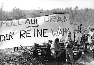 In 2009, Robin Wood ended its membership of FSC International in protest and limited itself to cooperation and membership of the FSC working group in Germany.[16] The association also ran a campaign against disposable cups under the slogan 'Avengers of the cups – forest protection instead of disposable cups'. Protests against coal-fired power generation were also an issue that was accompanied by campaigns.[17] Other issues include uranium transports through Germany and fracking.[18][19]