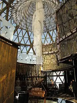 The restaurant is located on the top of the luxury Grand Lisboa hotel with a chandelier in the middle consisting of over 131,000 pieces of Swarovski crystal.[2] The restaurant has over 17,800 wines including a selection of rare wines by the glass and has multiple menus for both lunch and dinner including a la carte and tasting menus along with wine pairing options. The restaurant serves haute French cuisine such as their signature dish Le Caviar de Sologne with king crab, and crustacean jelly topped with rings of cauliflower cream, as well as Joel Robuchon's signature pommes purée.[3]