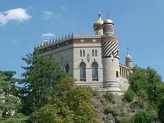 Before choosing Savignano for its castle, it seems that Cesare Mattei had visited several places. The place was preferred for many reasons: the ease of access, the rock forming a gigantic natural pedestal, and the location on the confluence of the rivers Limentra orientale and Reno. The predominant style of the building is Moorish, with additional medieval and modern Italian architecture.