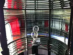 The original light apparatus consisted of ten Argand oil lamps and ten catoptric reflectors. In 1876 the optic was changed to a Second Order Fresnel lens, which is still in use. The lighthouse was converted to electric in 1970. The character of the light was occulting 20s (on for 15 seconds and off for 5 seconds). This was altered on 15 August 1993 to Fl WR 3s (one white and red flash every three seconds). From April 1978 the light has also been exhibited in conditions of poor visibility while the fog signal was sounding. Roche's Point has red sectors built into the main light to mark navigational hazards approaching the harbour such as the Daunt Rock near Robert's Cove and the Cow and Calf rocks just below the lighthouse. The sectors are as follows:[2]