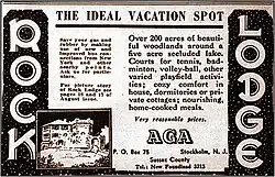 Rock Lodge Club is a naturist club located on 145 acres (59 ha) of privately owned land located in the Stockholm area of the Hardyston Township, New Jersey, which is situated on the New Jersey Highlands of North Jersey, about 40 miles (64 km) from Manhattan, New York.[1][2] Rock Lodge Club and Sky Farm, also based in New Jersey, were founded in 1932 as the first permanent nudist communities in the United States. Both clubs are active today.[3]