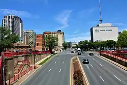 The road was also the path of the Seventh Street Railway, which took riders from Brightwood to downtown. The railway consisted of cars drawn by horses, guided by metal tracks that protruded above the road.[5][6] On April 12, 1890, Seventh Street Railway became electrically powered; its cable cars were powered by overhead electrical lines, and the cars themselves were guided by metal tracks embedded in the road.[5][6] Other electrically powered railways were built elsewhere in the District in later years.[5]