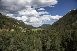 The montane ecosystem is at the lowest elevations in the park, between 5,600 to 9,500 feet (1,700 to 2,900 m), where the slopes and large meadow valleys support the widest range of plant and animal life,[60][61] including montane forests, grasslands, and shrublands. The area has meandering rivers[61] and during the summer, wildflowers grow in the open meadows. Ponderosa pine trees, grass, shrubs and herbs live on dry, south-facing slopes. North-facing slopes retain moisture better than those that face south. The soil better supports dense populations of trees, like Douglas fir, lodgepole pine, and ponderosa pine. There are also occasional Engelmann spruce and blue spruce trees. Quaking aspens thrive in high-moisture montane soils. Other water-loving small trees like willows, grey alder, and water birch may be found along streams or lakeshores. Water-logged soil in flat montane valleys may be unable to support growth of evergreen forests.[61] The following areas are part of the montane ecosystem: Moraine Park, Horseshoe Park, Kawuneeche Valley, and Upper Beaver Meadows.[61]