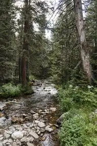 The riparian ecosystem runs through the montane, subalpine, and alpine tundra zones and creates a foundation for life, especially for species that thrive next to streams, rivers, and lakes.[65] The headwaters of the Colorado River, which provides water to many of the southwestern states, are located on the west side of the park. The Fall River, Cache la Poudre River and Big Thompson Rivers are located on the east side of the park. Just like the other ecosystems in the park, the riparian zone is affected by the climatic variables of temperature, precipitation, and elevation. Generally, riparian zones in valleys will have cooler temperatures than communities located on slopes and ridge tops. Depending on elevation, a riparian zone may have more or less precipitation than other riparian zones in the park, with the difference creating a shift in the types of plants and animals found in a specific zone.[66]