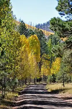 Ponderosa pine occurs as a mid-seral species and Douglas-fir is the climax forest in the Rocky Mountains. Quaking aspen and lodgepole pine are early-seral associates of ponderosa pine on these sites.[3][4][5]: 6 Ground-level vegetation includes ninebark (Physocarpus spp.), elk sedge (Carex geyeri), and pine grass (Calamagrostis rubescens). These species, in particular, exemplify aggressive survivors after disturbance (e.g., fire, mechanical site preparation) and are strong competitors for light and nutrients which compete with ponderosa pine seedlings.[6][5]: 6