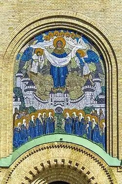 Another of Roerich's artistic subjects was architecture. His acclaimed publication "Architectural Studies" (1904–1905), consisting of dozens of paintings he made of fortresses, monasteries, churches, and other monuments during two long trips through Russia, inspired his decades-long career as an activist on behalf of artistic and architectural preservation. He also designed religious art for places of worship throughout Russia and Ukraine, most notably the Queen of Heaven fresco for the Church of the Holy Spirit, which the patroness Maria Tenisheva built near her Talashkino estate, and the stained glass windows for the Datsan Gunzechoinei in 1913–1915. His designs for the Talashkino church were so radical that the Orthodox church refused to consecrate the building.[10]