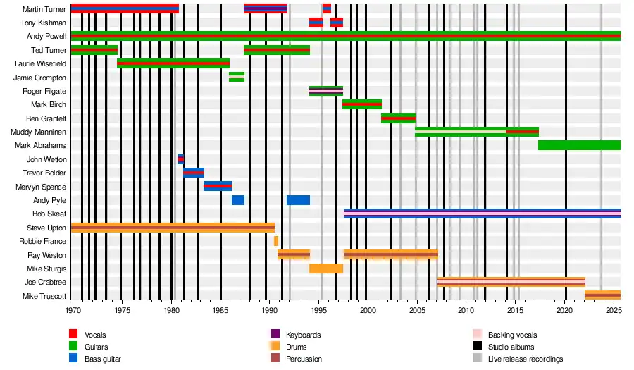 Powell rebuilt the band with the addition of guitarist Roger Filgate, bassist Tony Kishman and drummer Mike Sturgis.[17][18][19] Martin Turner briefly returned for the group's 25th anniversary tour in 1995 and began working on new material, before leaving for a third and final time.[15] After the release and touring of Illuminations, Filgate, Kishman and Sturgis were replaced by Mark Birch, Bob Skeat and Weston, respectively.[20] Birch remained until 2001, when he was replaced by Finnish guitarist Ben Granfelt.[21] After the studio album Bona Fide and live release Almighty Blues: London & Beyond, Granfelt left in 2004 after playing his final show on 30 October.[22] He was replaced by another Finnish guitarist, Jyrki "Muddy" Manninen.[23] Long-term drummer Weston left for a second time in early 2007 due to tiring of touring, with Joe Crabtree taking his place.[24] on 9 May 2017, when Mark Abrahams replaced Manninen as their ninth guitarist.[25] In 2022 Crabtree left the band and was replaced by Mike Truscott.[26]