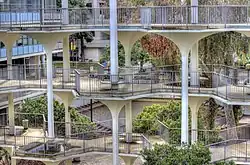 By the start of the 1965-1966 school year, Revelle College had grown to loosely resemble the modern campus, surrounding a central plaza. The completion of the sixth academic building, Building F (now York Hall), marked the end of its growth and the beginning of the establishment of John Muir College.[10][11] In addition to a library in Building E (Galbraith Hall), the college was equipped to house 440 undergraduates in the newly constructed Fleet residence halls.[12] An 800-seat cafeteria, the Plaza Cafe, was constructed to replace the canteen in the basement of Building C (Mayer Hall).[13] Blake and Argo Halls were added in 1968.[14]