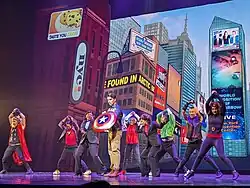 Before the show began, "period-appropriate jazzy tunes" were played through an onstage radio, one of which referenced the Elias & Co. store on Buena Vista Street in the park.[36] The performance includes the Starkettes, who serve as a Greek chorus for the show,[47] Rogers, Peggy Carter,[1] Abraham Erskine,[2] Nick Fury, and select members of the Avengers,[1] with the character's costumes resembling those from the films in a "fun, more casual" look.[48] Rogers: The Musical only features one cast (not typical for theme park shows, which usually have multiple performers for each role), many of whom were reportedly based out of New York and had Broadway experience.[49] The cast, as featured on the original cast album, includes: Bella Hicks and Krystle Rose' Simmons as the Starkettes; Josey Montana McCoy as pre-serum Rogers and Luke Monday as Rogers / Captain America; Rachel Wirtz as Carter; and Jay Donnell as Fury, among additional ensemble members.[6] Sarah Kobayashi from Disney Live Entertainment served as choreographer, with her choreography utilizing the show's different time periods to incorporate period-appropriate dance styles "with a modern twist". Kobayashi also tailored specific movements that would make sense for each character; for example, Thor can be seen joyfully dancing while Loki makes "sly moves".[26] Layered scenery, physical set pieces, and a video screen were used to create each setting in the show.[48] Bell chose to focus the one-act on the love story of Rogers and Carter since "[g]reat love stories make great musicals".[26]