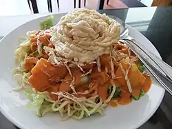 Rujak mie is a dish from Palembang, consisting of noodles, tofu, slices of pempek, cucumber, lettuce, and sweet spicy broth.[36]