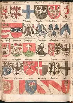 Wernigerode Armorial is a Bavarian roll of arms from around 1486–1492, containing 524 pages, 477 of which are illustrated with anywhere from one to thirty coats of arms (most of these have four coats of arms each).