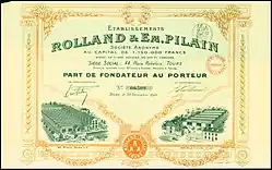 During World War I Rolland-Pilain produced shells and parts for aircraft engines using a female work force. The war also saw the successful Gnome et Rhône aero-engine manufacturer relocating production outside Paris, and one of their new manufacturing bases was established in Tours.[2] At the end of the war, in 1918, Gnome et Rhône invested in the Rolland-Pilain business, taking a majority share in it, but they disposed of their holding in 1920.[2] By this much of the management was passing from François Rolland to his son Lucien Rolland, but Émile Pilain sustained his own involvement, while his elder brother, Léon Pilain, who had previously worked in Paris for Delahaye was also now playing an increasingly important part in the business.[3]
