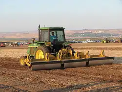 Rollers are a secondary tillage tool used for flattening land or breaking up large clumps of soil, especially after ploughing or disc harrowing. Rollers are typically pulled by tractors today. Before mechanised agriculture, a team of working animals such as horses or oxen provided the power. Animal power is still used today in some contexts, such as on Amish farms in the United States and in regions of Asia where draft oxen are still widely used.