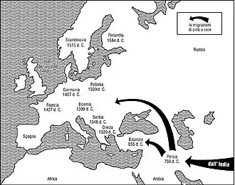 Linguistic evidence shows the Roma's emigration from Northwestern India to Europe, between the 3rd to 7th century AD,[17] and to Poland at around 1400.[10] Their emigration may be attributed to the surge in Roma killings during 1400–1500 in Western Europe, as Poland was relatively more welcoming.[18]