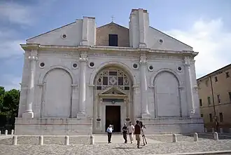 Because of the damage caused by the earthquake of 1786, and subsequent tremors, the liturgical functions of the cathedral had to be transferred to the church of S. Giovanni Evangelista, popularly called S. Agostino. When Bishop Vincenzo Ferretti was in Milan to attend the coronation of Napoleon Bonaparte as King of Italy, he obtained the decree allowing for the transfer of the episcopal seat to the Tempio Malatestiano (officially known as S. Francesco).[30]