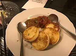 | Abbacchio alla romana[13] | ![]() | It is a preparation of lamb typical of the Roman cuisine.[14][15] It is consumed throughout central Italy as an Easter and Christmas dish.[14][15][16] Abbacchio is a product protected by the European Union with the PGI mark.[17] In Romanesco dialect, the offspring of the sheep who is still suckling or recently weaned is called abbacchio, while the offspring of the sheep almost a year old who has already been shorn twice is called agnello (lit. 'lamb').[18] This distinction exists only in the Romanesco dialect.[18] |