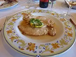 | Scaloppine alla romana | ![]() | Scaloppine (plural and diminutive of scaloppa—a small escalope, i.e., a thinly sliced cut of meat)[39] consists of thinly sliced meat, most often beef, veal, or chicken, that is dredged in wheat flour and sautéed in one of a variety of reduction sauces.[40] The sauce accompanying scaloppine can come in many varieties according to regional gastronomic traditions. Popular variations include tomato-wine reduction; scaloppine al limone or piccata, which denotes a caper-and-lemon sauce;[41][42] scaloppine ai funghi, a mushroom-wine reduction; and pizzaiola, a pizza-style tomato sauce.[43] |