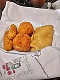 | Supplì | ![]() | Supplì (Italianization of the French word surprise) are snacks consisting of a ball of rice (generally risotto) with tomato sauce, typical of Roman cuisine.[44] Some believe that they derive from the French croquettes and were introduced to Rome by the French troops of Napoleon at the beginning of the 19th century.[45] |