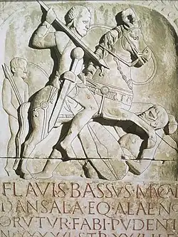 Pictorial evidence, such as the stele of Titus Flavius Bassus (eques of the ala Noricum) or Tomb monument of a cavalryman from 1st century AD (Romano-Germanic Museum, Cologne Germany) supports literary accounts that equites carried swords, such as the spatha, which was much longer than gladii hispanienses (Spanish swords) used by the infantry[24]. The Ahenobarbus monument also shows a cavalryman with a dagger (pugio). There is no evidence that equites carried bows and arrows and the Romans probably had no mounted archers before they came into contact with Parthian forces after 100 BC.