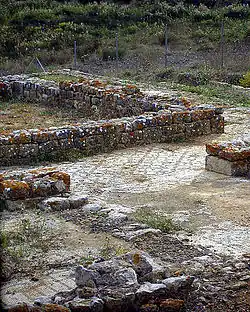 The protected site is an agricultural facility called a villa rustica. It consists of a large palatial residence called the villa maritima or pars urbana, and an economic area called the pars rustica. The villa covers an area of approximately 2000 square meters. The building's Mediterranean-style architecture included an attached portico with a view of the lagoon and the sea and exposed inhabitants to the mild climate. Colorful mosaics of floral and geometric compositions covered the floors. Since there was little agricultural area in the direct vicinity, the villa took its wealth from the nearby estuary.