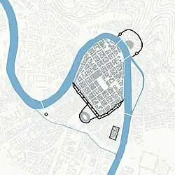 A new center was therefore founded on the other bank of the Adige River, where its wide bends formed a kind of natural peninsula, a valid defense against possible attacks. This also made it possible to build only two sections of curtain wall along the southern side of the city, the only one that was not naturally defended by the river.[4] The curtain wall was provided with two main gates, Porta Iovia (now called Borsari) along the decumanus maximus and Porta Leoni on the cardinalus maximus, as well as a series of towers placed at the decumanus and minor cardinus that acted as posterns: some of them were provided with a passage for chariots in the center of the street and two smaller side passages for pedestrians, at the sidewalks.[5]