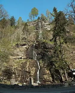 Near Romkerhalle, on the rocky eastern flanks of the Oker valley below a spur of the Huthberg, the Kleiner Romke (441.7 m above NHN),[9] the Romkerhall Waterfall (Romkerhaller Wasserfall) tumbles through a height of about 64 metres[10] over the Romke Klippe crags (contemporaneously also known as the Rohmkerklippe or Marmorklippe). Its height makes it the highest artificial waterfall in the Harz Mountains. To create the waterfall, some of the waters of the Oker tributary, the Kleine Romke, are diverted along a roughly 350-metre-long ditch.[9]