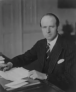 Brocket became known in society as a Nazi sympathiser.[3] He became a committed member of the Anglo-German Fellowship, and his homes were used for entertaining supporters of Germany. Brocket, who considered Minister for Foreign Affairs Joachim von Ribbentrop a close personal friend, was so enamoured with Nazi Germany, he attended Hitler's 50th birthday celebration in Berlin in 1939.[4] According to Neville Chamberlain, Foreign Secretary, the Earl of Halifax used Brocket as a conduit to convey the views of the British government to the leading German Nazis.