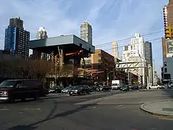 The Manhattan terminal is accessed through Tramway Plaza, on the west side of Second Avenue between 59th and 60th Streets.[202] MTA Regional Bus Operations' M15, M15 SBS, M31, M57, Q32, Q60, and Q101 buses stop near the terminal, while the New York City Subway's Lexington Avenue/59th Street station, served by the 4, 5, 6, <6>, N, R, and W trains, is one block west.[203]