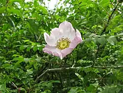 The pale pink, single flowers can be as wide as 7.5 cm (3 in).[3] Quite unusually for a rose, it can take on a tree-like growth form,[6] and reach up to 6 m (20 ft) tall. It has 4-9 pairs of leaves, the leaflets are each 1 to 3 cm (0.4 to 1.2 in) long. It flowers between May and June.[7]