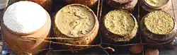 The food is cooked by suaras (also known as mahasuara or supakara), a sect that is given the charge since the beginning of the temple.[1] The food cooked in rosaghara is vegetarian and use of onion, garlic, potatoes and bottle gourd are not allowed.[2] A particular kind of earthenware known as kudua are used for cooking. Water drawn from two wells near the kitchen called Ganga and Jamuna are used for cooking. Over 500 varieties of food raja bhoga, chatra bhoga and jajamani bhoga are cooked that are offered to Jagannatha, Balabhadra and Subhadra in the temple pedestal ratnabedi and food offering pedestal Bhoga Mandapa five times a day.[3] Chapana bhoga, 56 varieties of cooked food are offered almost every day.[4] The food, after being offered to Jagannath, is sold at Ananda bajara as abadha. Ananda bajara is an open market, located to the North-east of the Singhadwara (major entrance) inside the temple complex. Every day food for over 5000-10000 is cooked where in special occasions food for over 10 million people is cooked in rosaghara.[5] There are two passages to the food out from the kitchen; the first one leads to bhoga mandapa for larger kotha bhoga and chatra bhoga, and the other one leading to the inner sanctuary of the temple for the kotha bhoga offering.[6] Except the suaras no one is allowed to go near the kitchen or even touch the food until they are offered at the traid of the temple.[3]