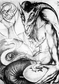 The result was published as The Art of Rosaleen Norton in 1952, and contained such paintings as Black Magic, Rites of Baron Samedi and an image depicting the horned demon Fohat, with a snake for his phallus, whilst Greenlees' poems featured in the work included The Angel of Twizzari and Esoteric Study.[25] Restricted to a limited edition of 500 copies, The Art of Rosaleen Norton had been produced to a high quality, with each edition being bound in red leather with gold blocking, illustrated endpapers, and ribbon marker. It contained 31 black-and-white reproductions of artworks by Norton (29 of which were full-page or near full-page plates). This work was banned in New South Wales on the grounds of obscenity, and subsequently its import into the US was forbidden. The publisher, Walter Glover, had intended an edition of 1000 copies (so stated in the book), 650 to be bound in cloth (ordinary edition) and 350 in leather (the edition deluxe), with the first 20 copies of the leather edition to include a colour artwork by Norton. Only a small number – probably less than 20 – were issued in leather due to the prohibitive cost and it is also certain that far fewer than the intended 650 copies were bound in cloth, although the exact number that were distributed is unknown. Copies numbered up to 505 are known to exist.