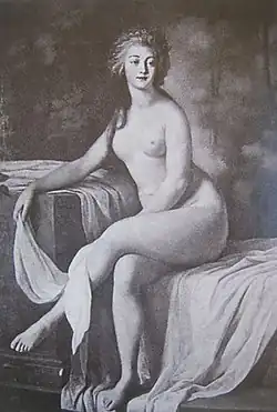 Duthé was often requested by portrait painters for sittings, including for partial and full nudes.[12] She was painted by François-Hubert Drouais in 1768, for a full-length portrait now held by the English branch of the Rothschild family.[12] Salbreux-Perin, better known as a miniaturist, made at least five portraits of Duthé, including a nude of her sitting modestly at the end of her bath that was intended for the bathroom of the Comte d'Artois at Bagatelle.[12] Another shows her lying naked on her bed, hair disheveled, now among the collections of the Museum of Fine Arts, Rheims.[12] Antoine Vestier (1740–1824) painted the nude Portrait of Rosalie Duthé (c. 1780).[13]