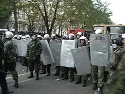 Two events in 2001 caused an outcry of public opinion against the government. In July, a popular anchor for the Rustavi-2 network, Giorgi Sanaia, was murdered. The consensus among Georgian journalists and the public was that he was killed because of his anti-government work on the Chechen conflict and corruption investigations.[11] In October, agents from the National Security Ministry raided the headquarters of Rustavi-2. The tax-raid was broadcast on television from outside the building. Upwards of seven thousand student-led protestors, many mobilized by the Liberty Institute NGO, amassed outside the headquarters and demanded the resignation of the Shevardnadze government. Shevardnadze responded by sacking his cabinet and his minister of security.[21] Importantly, this event triggered the defection of Mikheil Saakashvili and the abdication of Zurab Zhvania from their positions in the Citizens' Union of Georgia, eventually leading to the formation of the National Movement and United Democrats opposition parties.[22]