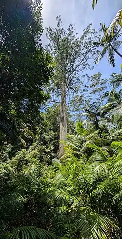 E. grandis is found on coastal areas and sub-coastal ranges from the vicinity of Newcastle in New South Wales northwards to Bundaberg in central Queensland with disjunct populations further north near Mackay, Townsville and Daintree in northern Queensland, mainly on flat land and lower slopes. The soils are deep fertile alluvial loams. The annual rainfall varies from 1100 to 3500 mm.[2] It is the dominant tree of wet forest and rain forest margins,[4] either growing in pure stands or mixed with trees such as blackbutt (E. pilularis), tallowwood (E. microcorys), red mahogany (E. resinifera), Sydney blue gum (E. saligna), pink bloodwood (Corymbia intermedia), turpentine (Syncarpia glomulifera), brush box (Lophostemon confertus) and forest oak (Allocasuarina torulosa).[2]