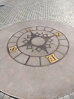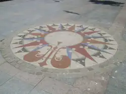 A compass rose or compass star, sometimes called a wind rose or rose of the winds, is a polar diagram displaying the orientation of the cardinal directions (north, east, south, and west) and their intermediate points. It is used on compasses (including magnetic ones), maps (such as compass rose networks), or monuments. It is particularly common in navigation systems, including nautical charts, non-directional beacons (NDB), VHF omnidirectional range (VOR) systems, satellite navigation devices ("GPS").