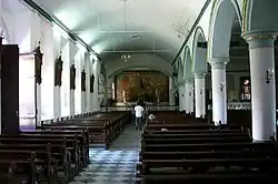 This church survived until 1816 when it was destroyed by hurricane. The present church, which was built 24 years later, located at the same site, was also found to be inadequate to meet the growing needs of church goers. This was a result of the abolition of slavery and permitting former slaves to attend church services. Black and white people sat together to worship in the pews without discrimination. The expansion program which began took almost 100 years to complete to its present form. The additions to the cathedral started with a steeple built in 1855, followed by a wooden ceiling for the cathedral in 1865 by the Kalinagos who cut and brought simaruba trees from the northeast of Roseau; it took them three months to build the wooden ceiling. During this period, a large stone pulpit was also erected. This stone pulpit was carved by prisoners who were kept in Devil's Island (located off the coast of French Guiana).[2][9] In the year 1873, at the southeast end, the Chapel of St. Joseph came to be established along with a crypt where bishops and priests could be buried.[2][3] In 1853, the town and the parish had a population of 6000 Catholics. As the Catholic Ministry did not support the building activity, the Catholic community carried stones to the site to build the church.[7] A hurricane in 1863 caused substantial damage to the cathedral, which necessitated raising funds not only for its restoration, but also for many other churches on the island, which also had been destroyed by the hurricane. Funds were raised by imposing a levy on the French planters.[10]