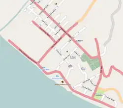The location of the cathedral is in the southern part of the town of Roseau on the banks of the Roseau River, which assures a good water supply. The availability of a large plane of land on the south river bank also dictated the cathedral's location.[2][6] The cathedral is located to the north of the Fort Young Hotel and northeast of the Dominica Museum.