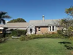 The site is divided by the large two storey masonry complex constructed in the late 1980s. To the west are the former Medical Officer's Quarters facing Lutwyche Road, a single storey timber-framed building elevated on concrete stumps with a hipped corrugated iron roof and walls clad in pine chamfer boards. It contains two bedrooms, a kitchenette, lounge, entrance porch and verandah which has been enclosed. The building is presently unoccupied.[1]