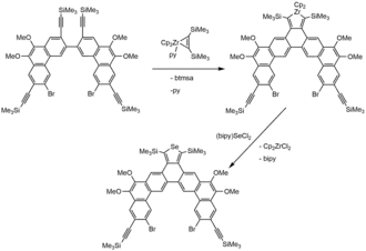 Tilley group's functionalization reaction of extended polycyclic aromatic hydrocarbons (PAH) with zirconocene bis(trimethylsilyl)acetylene pyridine to incorporate selenium into the PAH.