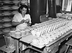 In the period of national socialism, Philipp Rosenthal, while Catholic, had to withdraw from the enterprise in 1934 because of his Jewish origin.[4] The Board of Management and the supervisory board turned against Rosenthal and implemented various measures to prevent Philipp Rosenthal from using his voting shares in order to change the composition of the management board and the supervisory board. The government was asked for support and sold the voting shares to persons who were not well-disposed towards Rosenthal.[5] However, the Nazi regime did not go directly against Philipp Rosenthal in order not to jeopardise the foreign business of the company. The reasonably covertly concealed Aryans took advantage of the family, and urged Rosenthal's successor to step out of the company. Philipp Rosenthal's death in 1937 finally paved the way for his grandchildren. In 1936, Rosenthal bought the porcelain manufacturers Waldershof and Thomas in Weidenberg-Sophienthal. Rosenthal Isolatoren GmbH (RIG) was established in 1939 with branches in Erkersreuth (Selb) and Hennigsdorf near Berlin. In 1939 the company changed to Rosenthal Porzellan AG. When the Decree on Companies of Deprived Commercial Enterprises (RGBI 1941, p. 177), adopted on 27 March 1941, forced the discontinuation of the Jewish company and brand name Rosenthal, the "Aryan" management intervened through Joseph Goebbels to continue the use of the Rosenthal brand name.[6]
