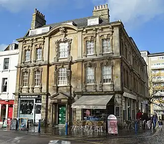 Today, the building is occupied by number 12, 13 and 14 Kingsmead Square and numbers 1 and 2 Kingsmead Street. The house is named after Thomas Rosewell,[2] who commissioned it from architect John Strahan and whose sign, a rose and a well, can be seen on the baroque facade[3] with the date 1736. It is a three-storey building with a mansard roof. The ground floor has been changed to include shop fronts, but a detached Ionic porch can still be seen. Dr Joseph Butler, the Bishop of Durham and a theologian, apologist and philosopher, died at Rosewell House in 1752.[1]
